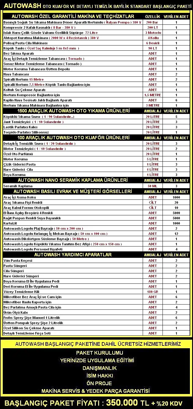 AutoWash bayiliği için aşağıdaki bayilik paketini başlangıçta alıyorsunuz, sonrasında bayilik süresince tek yapmanız gereken sadece eksilen ürünlerinizi merkezimizden sipariş ediyorsunuz. Aylık Cirodan kâr payı, aylık yada yıllık isim hakkı ve eğitim bedeli bayiliğimiz Pinco kesinlikle alınmaz.